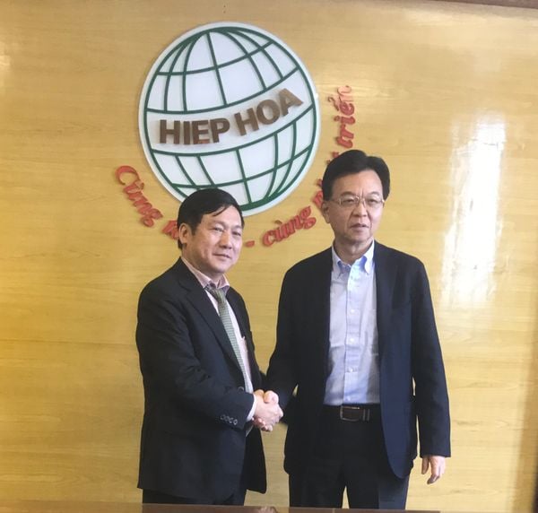 Tổng giám đốc công ty TNHH Thương Mại và Thiết bị Môi trường – ông Đào Mạnh Hùng bắt tay với Chủ tịch tập đoàn FURUKAWA – ông Naohisa Miyakawa trong chuyến thăm nhà máy Hiệp Hòa